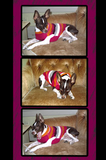 I always watch from the window when Mom goes out to get the mail. Today was different cause instead of coming in and throwing the mail in the trash, mom was excited about what had been delivered. It was something she ordered on e-bay. A pretty sweater for her baby girl. I don't mind wearing clothes cause it usually means I get to go bye-bye or at least outdoors. But this time mom just wanted me to try the sweater on to see if it fit. It fits perfectly. And I think I look dang good in it to! And the bestest thing? The sweater only cost $5.84 and that included shipping!
